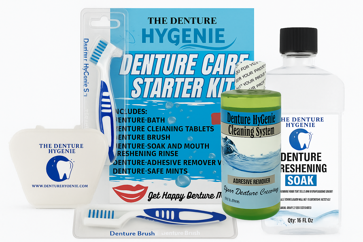 This complete denture starter kit provides everything you need for proper denture care from day one. The kit includes a convenient denture cup for storage, cleaning and whitening tablets to keep your dentures sparkling, a specialized denture brush for gentle cleaning, and a refreshing mouth rinse formulated for denture wearers. Also included are denture adhesive for a secure fit, convenient remover wipes for easy adhesive removal, and breath mints to keep your breath fresh. This comprehensive kit is perfect for individuals who have recently received new dentures, making the transition to denture care simple and straightforward. It's designed to help you maintain optimal oral hygiene and confidence with your new dentures.